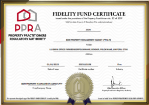 As a compulsory requirement, the company is certified by Estate Agency Affairs Board (EAAB) to manage properties. BDM’s Fidelity Fund Certificate number: Ref no: F148205. Refer to attached Fidelity Fund Certificate to validate our compliance with EAAB and Property Practitioners Act.